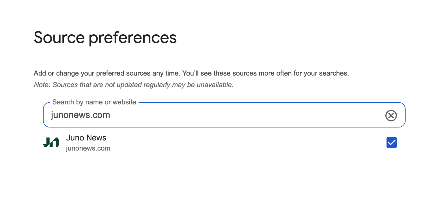 Feel free to layer in other trusted sites too – you can edit or remove preferences anytime without hassle. Even with Juno News boosted, Google keeps a diverse mix of voices in the mix.