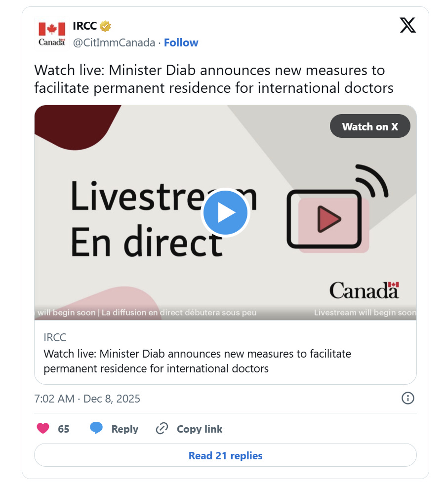During a press conference in Toronto, Liberal Immigration Minister Lena Metlege Diab, along with MP Maggie Chi, the parliamentary secretary to the health minister, announced the government would be creating a permanent residence pathway for internationally trained doctors who have at least one year of Canadian experience in their field, gained within the last three years, starting in 2026.
