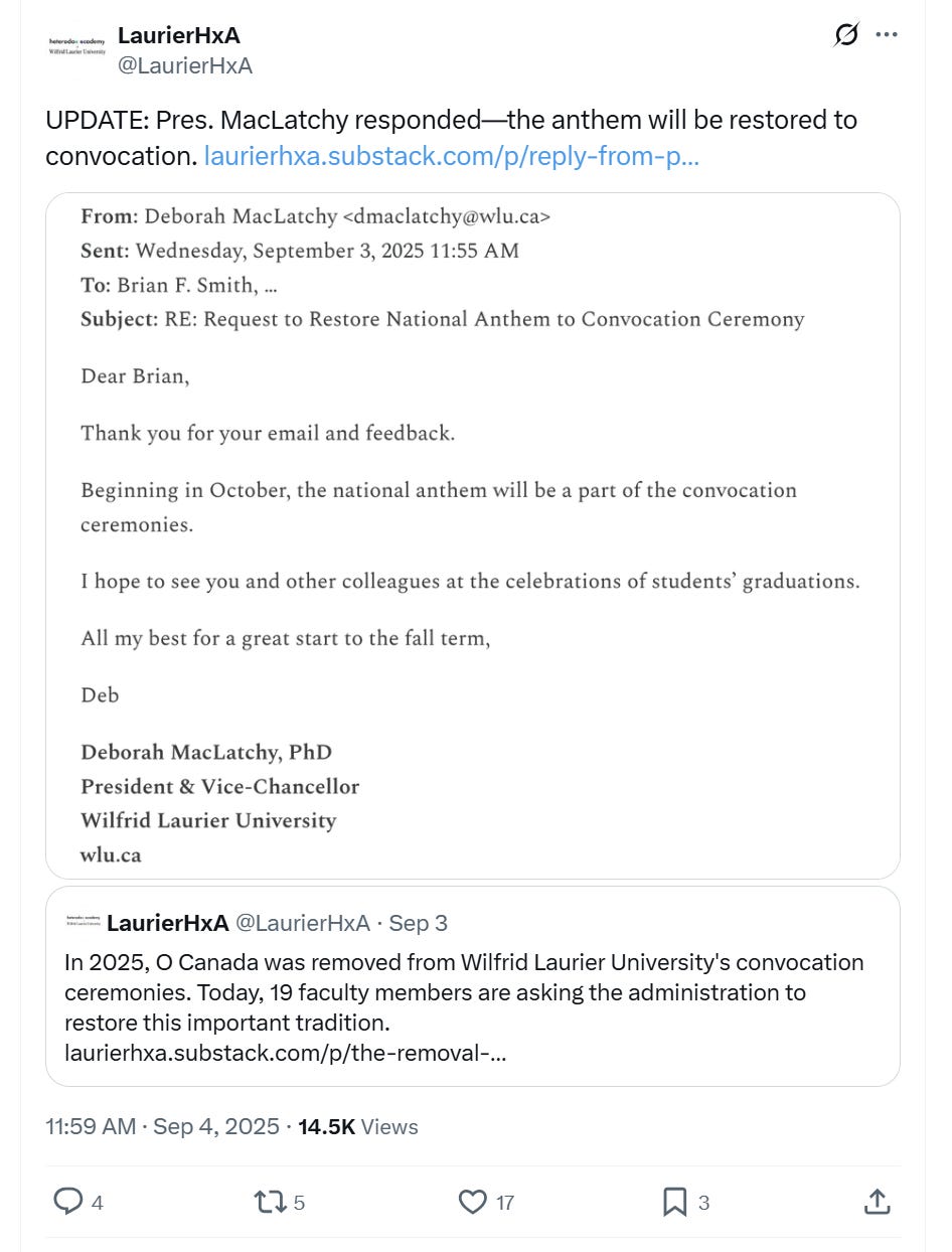 The message, posted publicly by the campus-based Laurier Heterodox Academy group on X, comes after months of debate on the decision to drop the anthem.