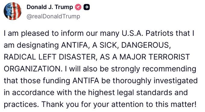 “I will also be strongly recommending that those funding ANTIFA be thoroughly investigated in accordance with the highest legal standards and practices,” posted Trump on Truth Social.