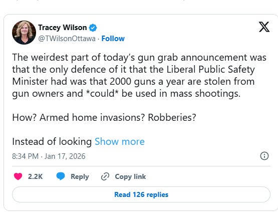 Tracy Wilson of the Canadian Coalition for Firearms Rights accused the government of targeting lawful owners instead of addressing firearm theft and violent crime.