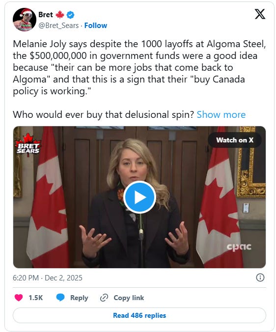 In September, the Carney government provided Algoma with a $400 million loan, while the Ontario government agreed to put up $100 million under the same terms. The company first applied for a $500 million loan from the Liberals back in July.