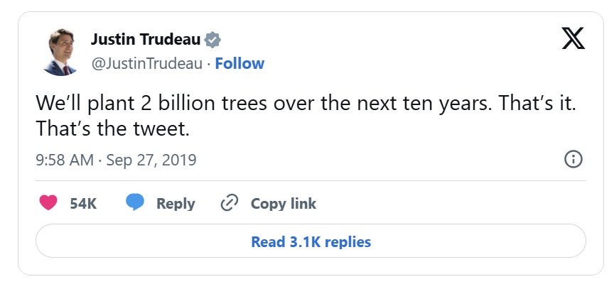 Internal memos obtained by Blacklock’s Reporter previously revealed the “two billion trees” figure had been chosen “as a slogan, not to be taken literally.” One departmental source reportedly admitted, “I can’t give an exact date on when the two billion trees will be planted exactly.”