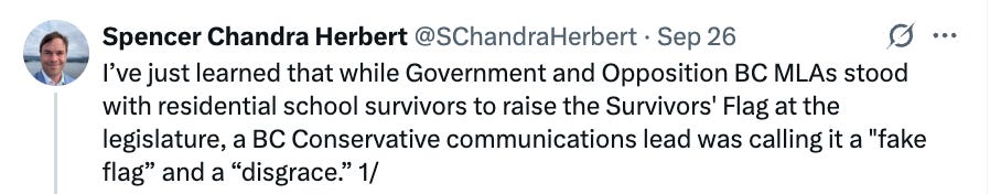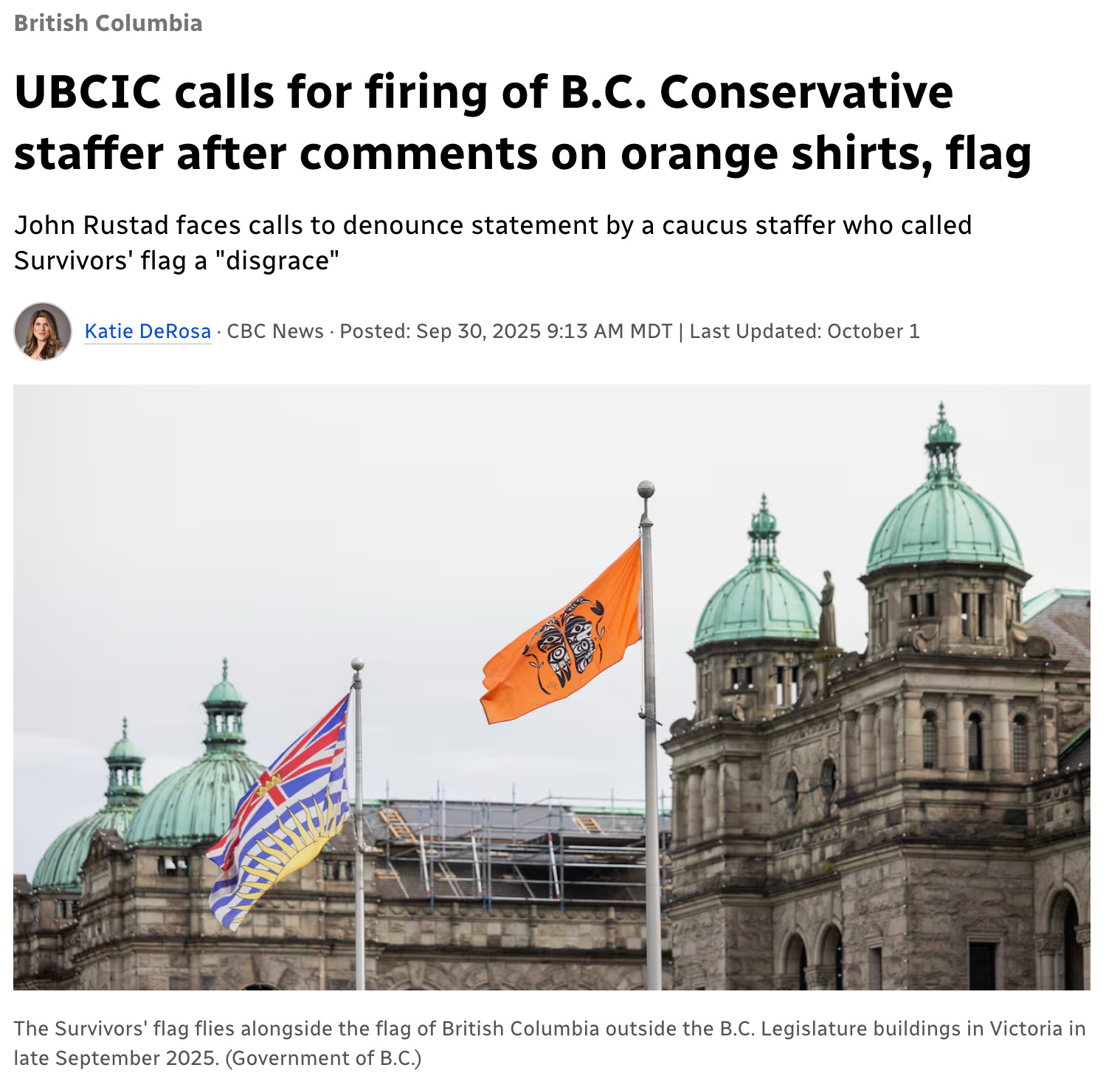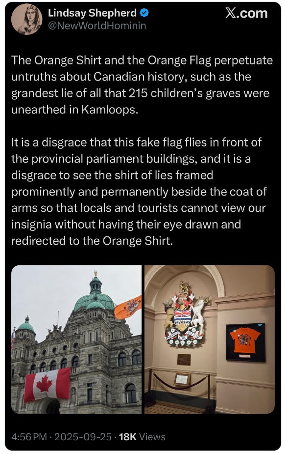 Just before the National Day for Truth and Reconciliation on September 30, I took to my personal X account to critique the fact that the B.C. Legislature building was flying an orange flag and displaying an orange shirt.