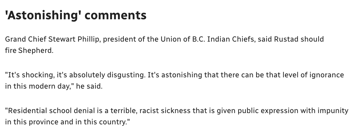 Unfortunately for Rustad, the base doesn’t want to prop him up anymore. Because for some of us, the “truth” part of “National Day for Truth and Reconciliation” matters, and we don’t like it when pandering politicians think they can dictate the terms of open inquiry.