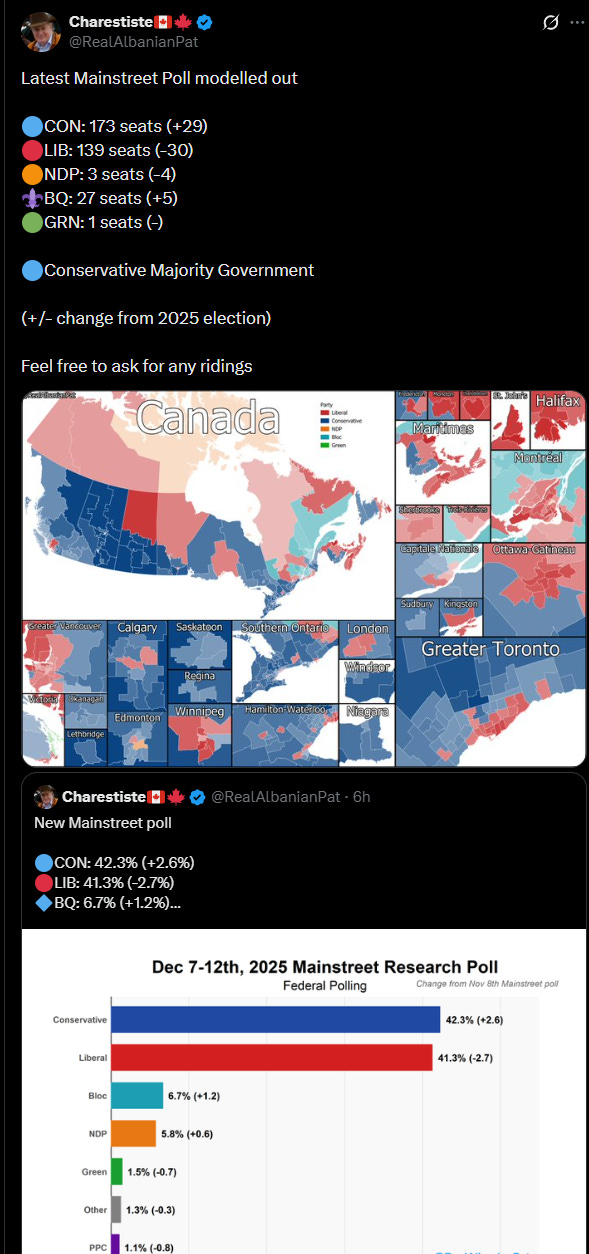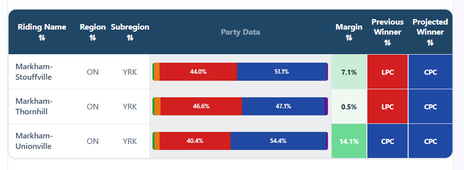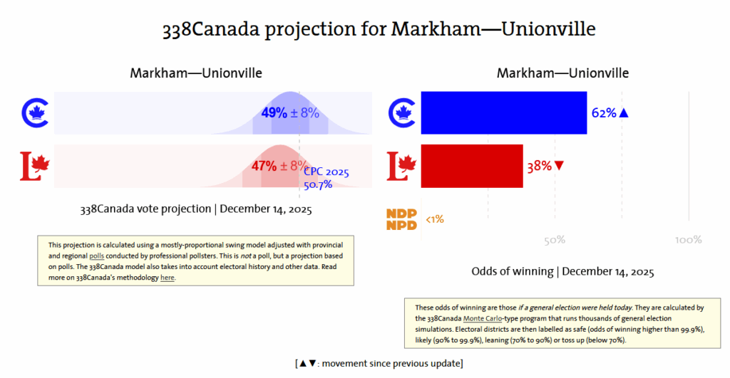 Meanwhile, polling model, Poliwave, which incorporates recent Mainstreet Research polling, identifies Markham–Unionville as leaning Conservative by a 14.1% margin.