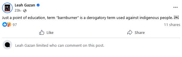 Manitoba MP Leah Gazan stated that the term “barnburner” is a “derogatory term used against indigenous people.”