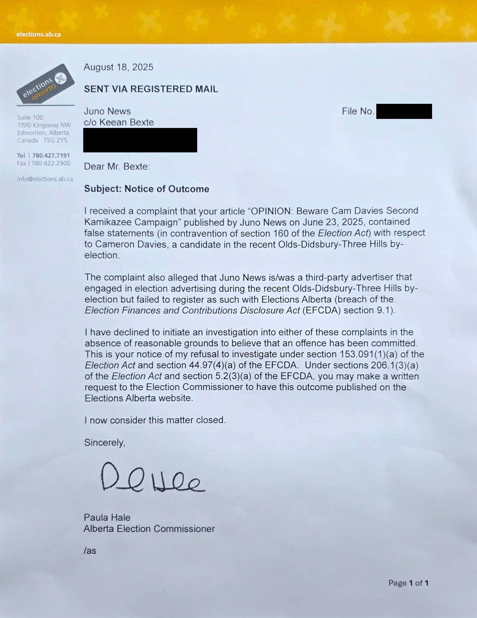 On the heels of the targeted federal investigation into our exclusive coverage of former Liberal candidate Thomas Keeper, Alberta’s Election Commissioner has dismissed a similar complaint against Juno News over our reporting during the provincial Olds–Didsbury–Three Hills by-election.