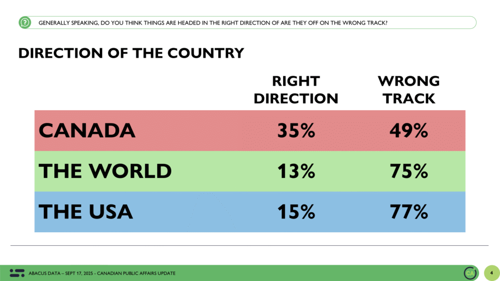 On the country’s direction, 35 per cent of respondents say Canada is headed the right way, while 49 per cent believe it is on the wrong track, virtually unchanged from earlier in the summer.