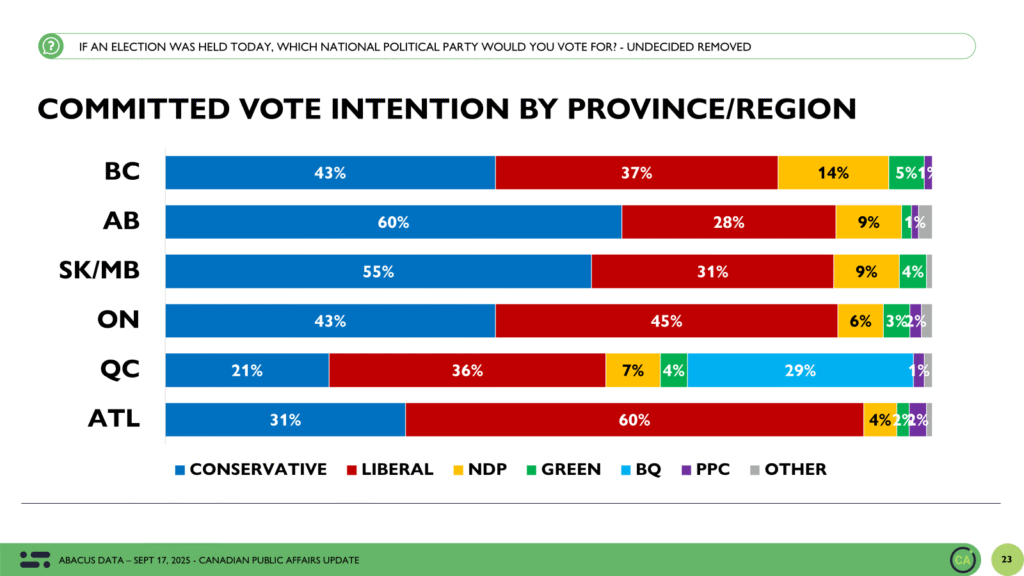 The poll shows support for the Conservatives and Liberals tied at 40 per cent. Regionally, the Conservatives lead in the Prairies, BC, and are statistically tied in Ontario. The Liberals maintain their firm lead in Atlantic Canada and lead in Quebec.
