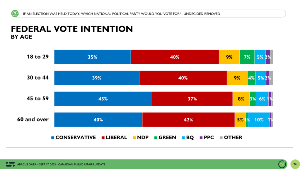 Notably, the Liberals large lead with those aged 60 and over - crucial for the Liberals’ victory in the spring election - has diminished to a near tie.