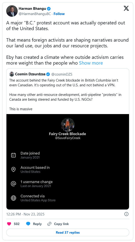 The geolocation of the @SaveFairyCreek X account to the United States mirrors the pattern Krause has documented: environmental activism in Canada often operates within networks of U.S.-based funding, staffing, or digital infrastructure.