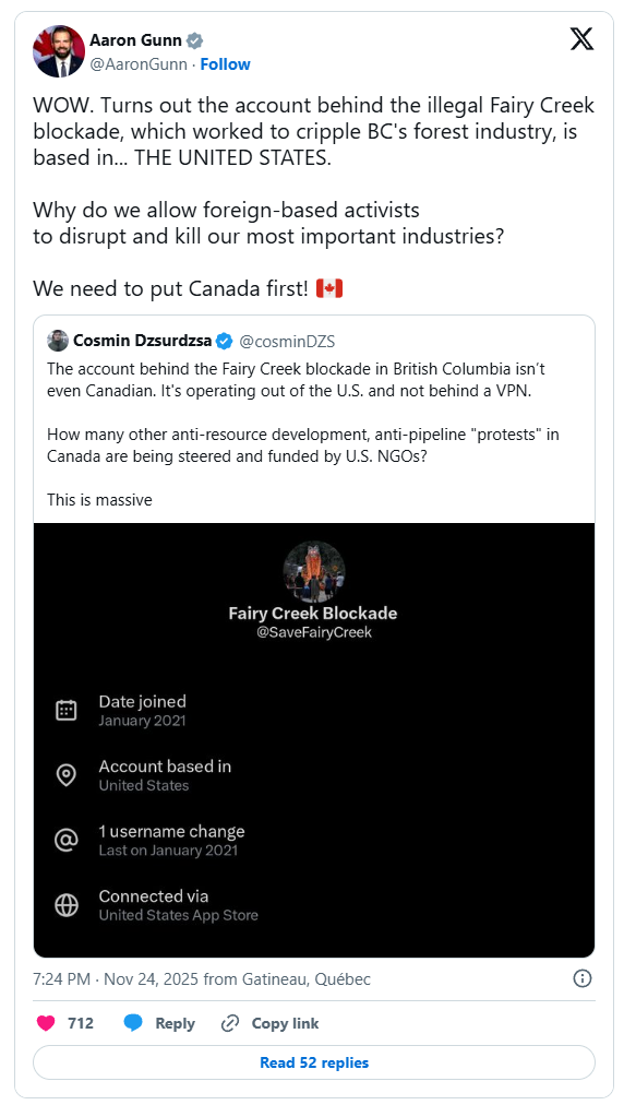 Conservative Party MP for North Island—Powell River Aaron Gunn reacted to the possible revelation, asking, “Why do we allow foreign-based activists to disrupt and kill our most important industries?