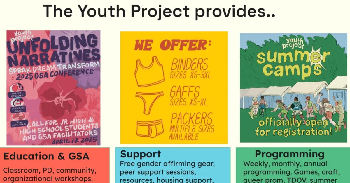 Among the items offered by The Youth Project free of charge to youth include chest binders, groin packers, trans tape, tucking underwear and prosthetic breasts.