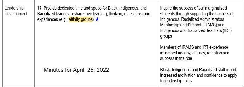 Board minutes from April 25, 2022, confirm that these groups were part of the WRDSB’s official “Leadership Development” strategy, directing staff to “provide dedicated time and space for Black, Indigenous, and Racialized leaders.” That entry, recorded as Resolution 280, described the groups as a way to “inspire the success of marginalized students” through the “success of Indigenous, Racialized administrators and teachers.”