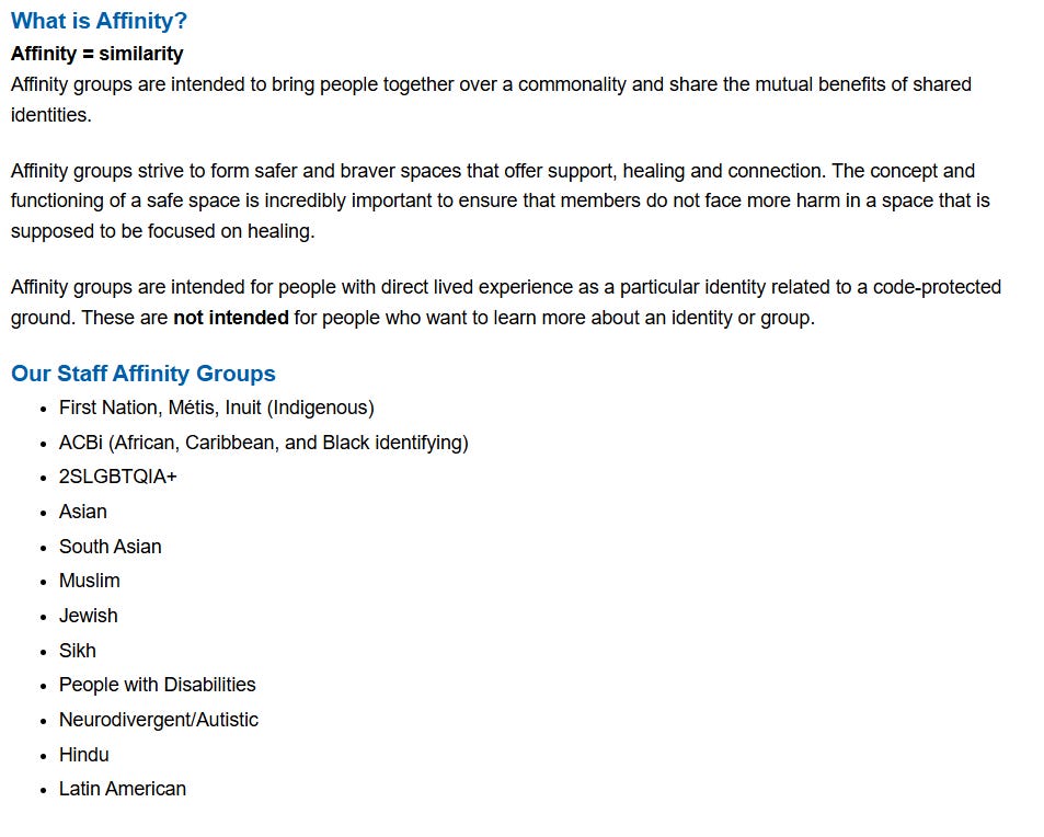 The source who shared the email told True North that the groups amount to publicly funded segregation. While couched in the language of equity, the source said they believe these groups are “a misappropriation of the Ontario Human Rights Code.” They said that “affinity groups are a code phrase for deliberate racial, religious, and sexual segregation.”