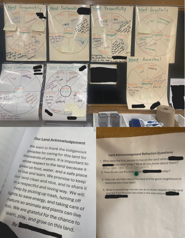 Simcoe County isn’t the only school board training students to use land acknowledgements in this way. True North obtained land acknowledgements written by Grade 3 students at another Ontario school board, which cannot be identified to protect the source from reprisal. In that instance, a teacher had their class write their own land acknowledgements, embedding Indigenous themes and social justice concepts into literacy instruction. It’s unclear if parents are aware that standard class time, including literacy and math, was used for this purpose.