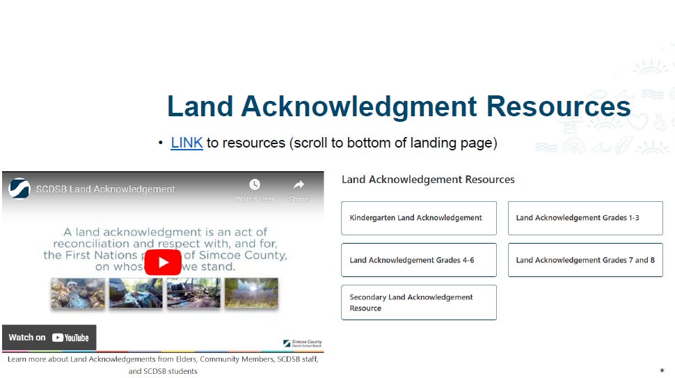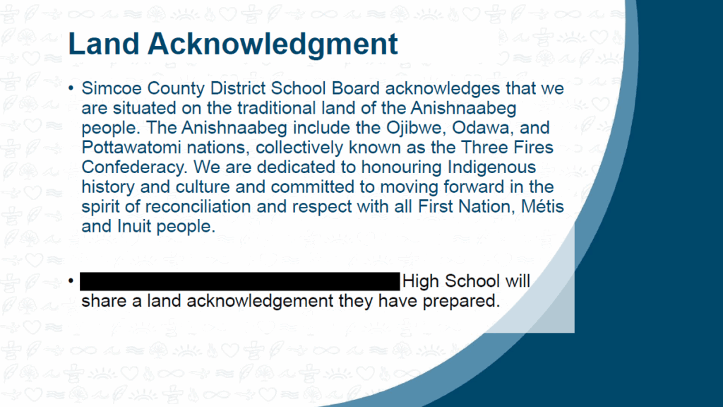 Slides from 2024–25 “Professional Learning Series” on “Indigenous Education” included examples of land acknowledgements written by students at the Simcoe County District School Board. Teachers were trained on how to write their own land acknowledgements and provided with resources to guide students in creating their own. Similar exercises are taking place in other Ontario school boards.