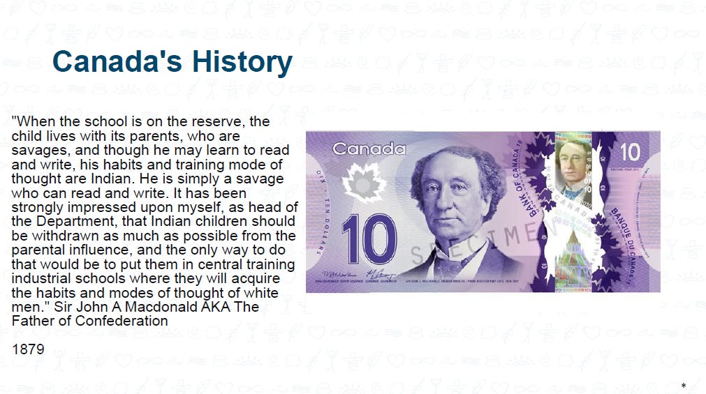 Historical context is also emphasized. A House of Commons speech from 1883 by John A. Macdonald, in which he promoted residential schools, appears in multiple training decks.
