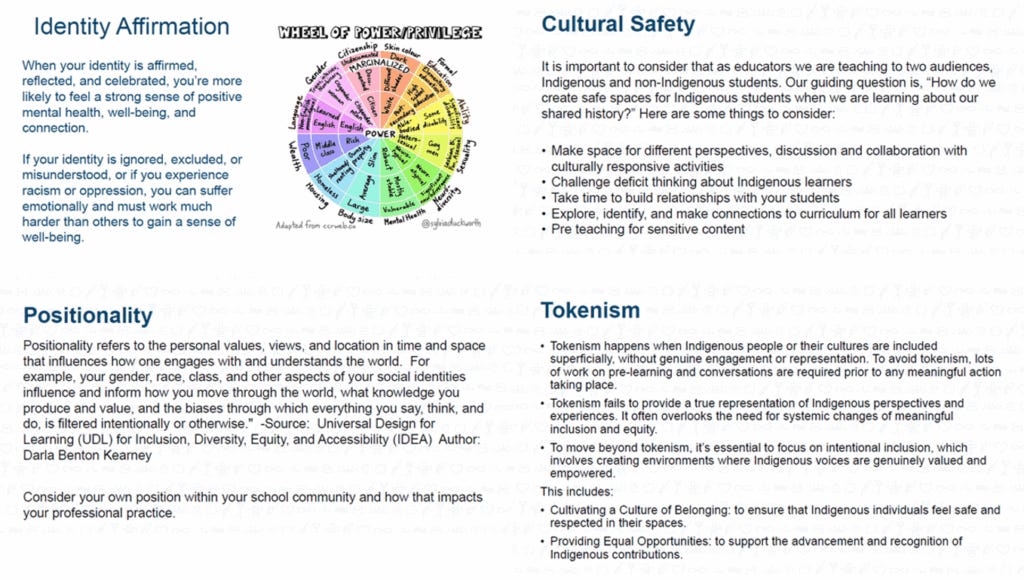 The training materials ask teachers to “move beyond tokenism,” defined as the superficial inclusion of Indigenous people or culture without “genuine engagement or representation.” To achieve “meaningful action,” teachers are encouraged to engage in “pre-learning and conversations” that support “systemic changes of meaningful inclusion and equity.”
