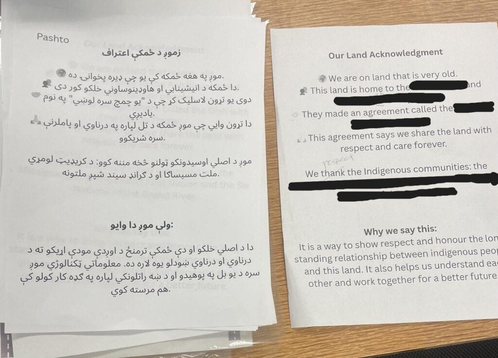 Curiously, one land acknowledgement was also translated into Pashto, spoken primarily by the Pashtun people of Afghanistan and Pakistan.