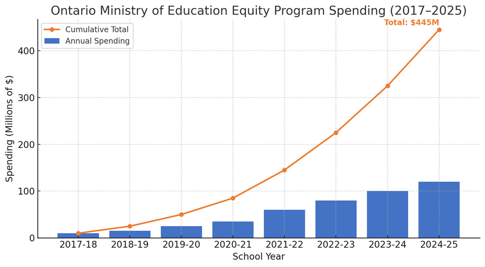 Taken together, these programs represent a sweeping realignment of Ontario’s education system around equity ideology. Between the launch of the Education Equity Action Plan and the 2024–25 school year, the province will have spent approximately $445 million on equity-driven programs — a figure projected to exceed $500 million by 2026 as ongoing initiatives continue.