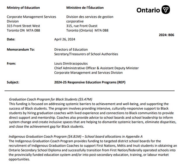 By 2024–25, the Ministry of Education was spending roughly $30 million per year on related equity-based programs. These include training teachers in “anti-oppressive” and “culturally relevant” pedagogy, subsidizing board-level human rights and equity advisors, and supporting de-streamed Grade 9 classrooms designed to eliminate what the ministry calls “systemic bias” in academic placement.