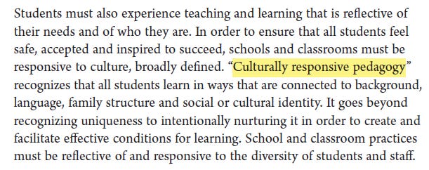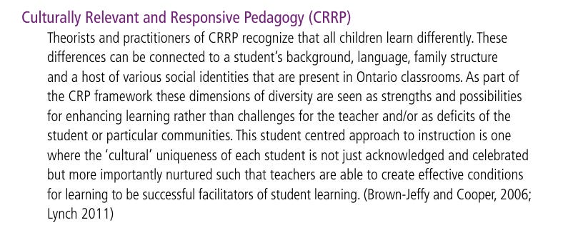 Ontario’s School Effectiveness Framework from 2013 described CRRP as a way to treat students’ “background, language, family structure,” and “various social identities” as strengths to be emphasized in teaching, omitting the political roots of the scholarship.