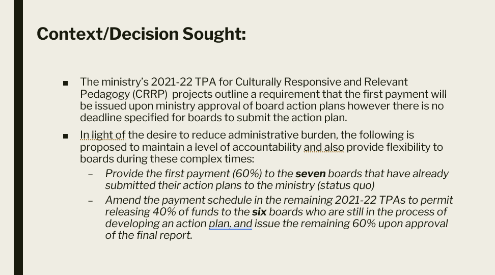 Under the program rules, 60% of the money was released once a board submitted its CRRP action plan, with the remaining 40% delivered after a final report demonstrating how the training and teaching changes were applied.