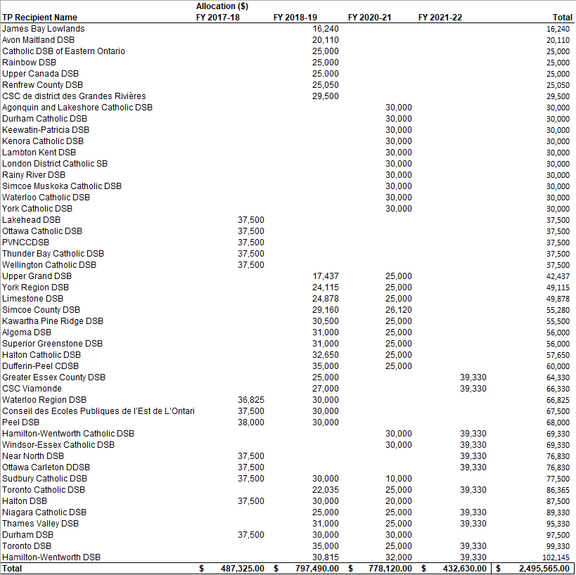 Between 2017 and 2022, 13 to 29 boards received funding each year. In 2017–18, the total was $487,325. By 2018–19, the amount rose to $797,490. Another $778,120 was distributed in 2020–21, and $432,630 in 2021–22, when the de-streamed math rollout began.