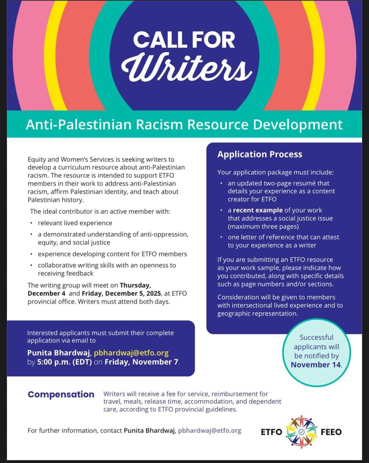 The new anti-Palestinian racism project is the latest in a series of union initiatives promoting equity and social justice frameworks across Ontario’s education system. The selected contributors will be notified in mid-November and will begin writing next month.