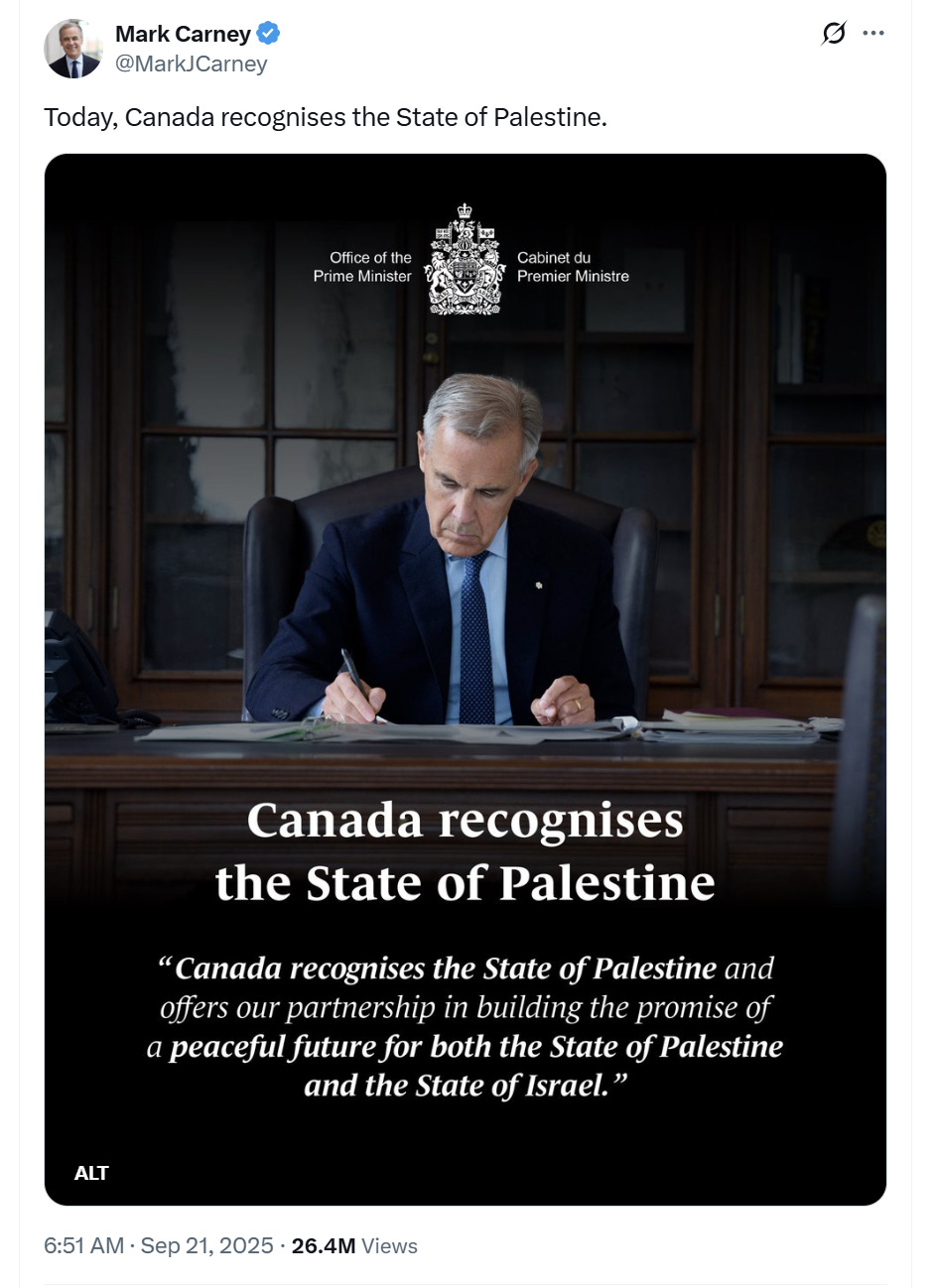How is it that Carney can unilaterally recognize Palestinian statehood without debate or a parliamentary vote, especially considering that the same initiative was soundly voted down not that long ago. Was there a commons vote that I missed? Are we a dictatorship or living in a monarchy now?