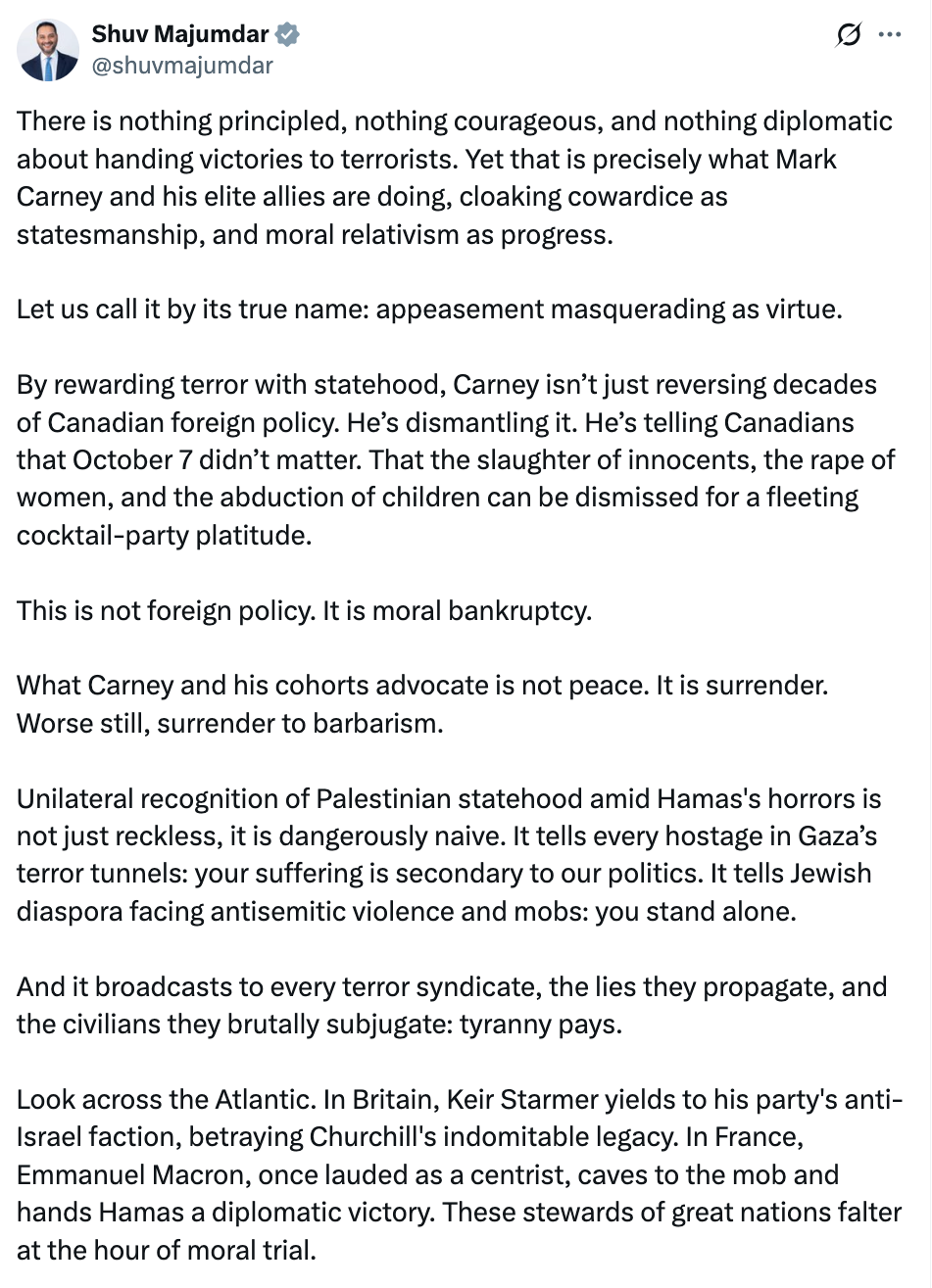 Carney is operating as a king. He did not take this to parliament to be voted on. I believe you are correct that he cares more about the votes of the Muslims that have taken to the streets to spew hatred not only against Jews but also against Canada.