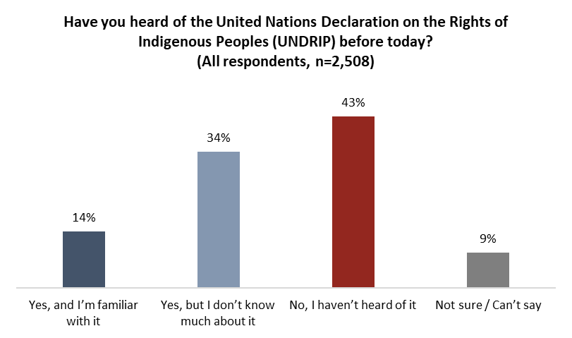 Sampling errors are compounded by participant ignorance: Despite Parliament enshrining UNDRIP into law in 2021, many Canadians have never heard of it. Two-in-five (43%) are unaware of UNDRIP, while 34% say they know little about its contents.