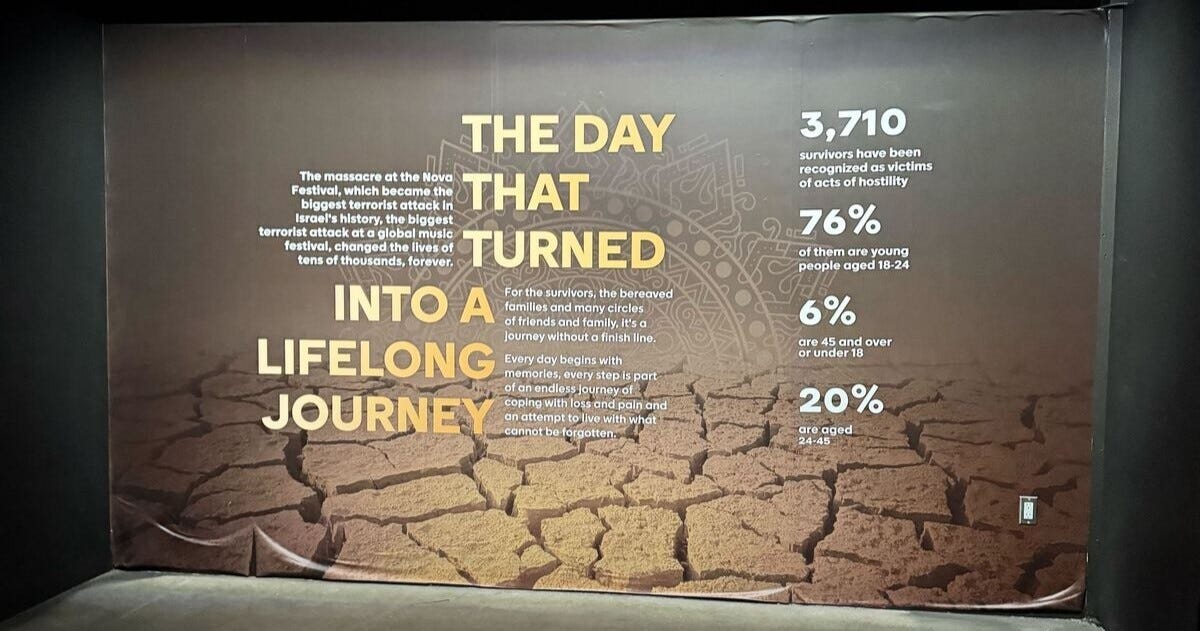 It is a masterpiece and it is raw— recreating the festival with artifacts from the event, including burnt out vehicles, bullet-ridden bathroom stalls and the clothing, shoes and other personal belongings left behind by those Israelis who tried to escape the terrorists.