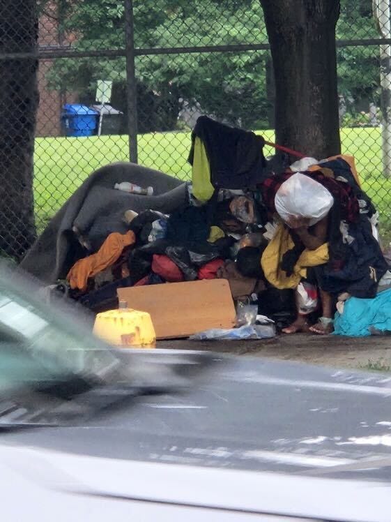 The black man I wrote about in early August, across from the entrance to the Distillery District, is still there with a bag over his head and scabs on his legs.