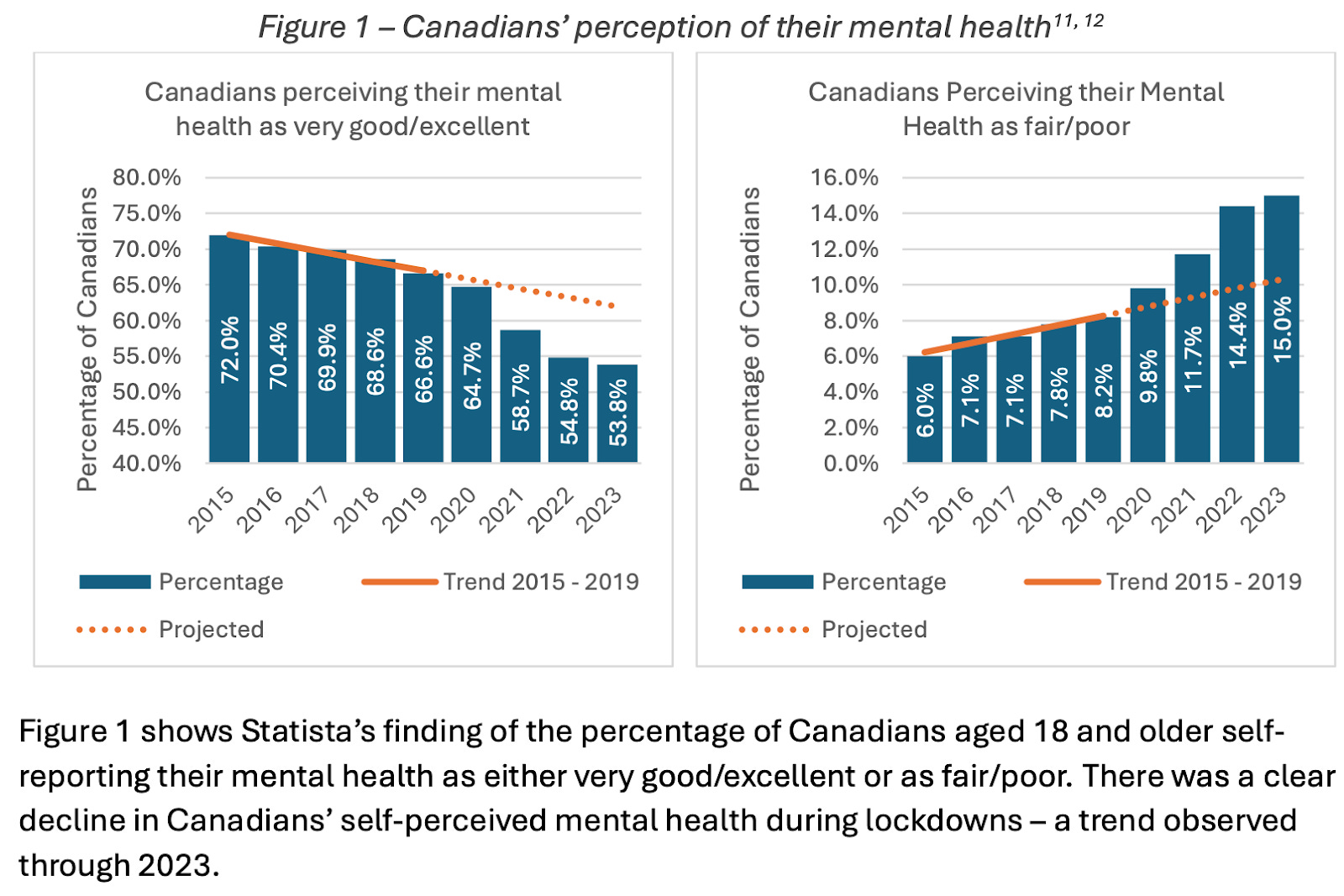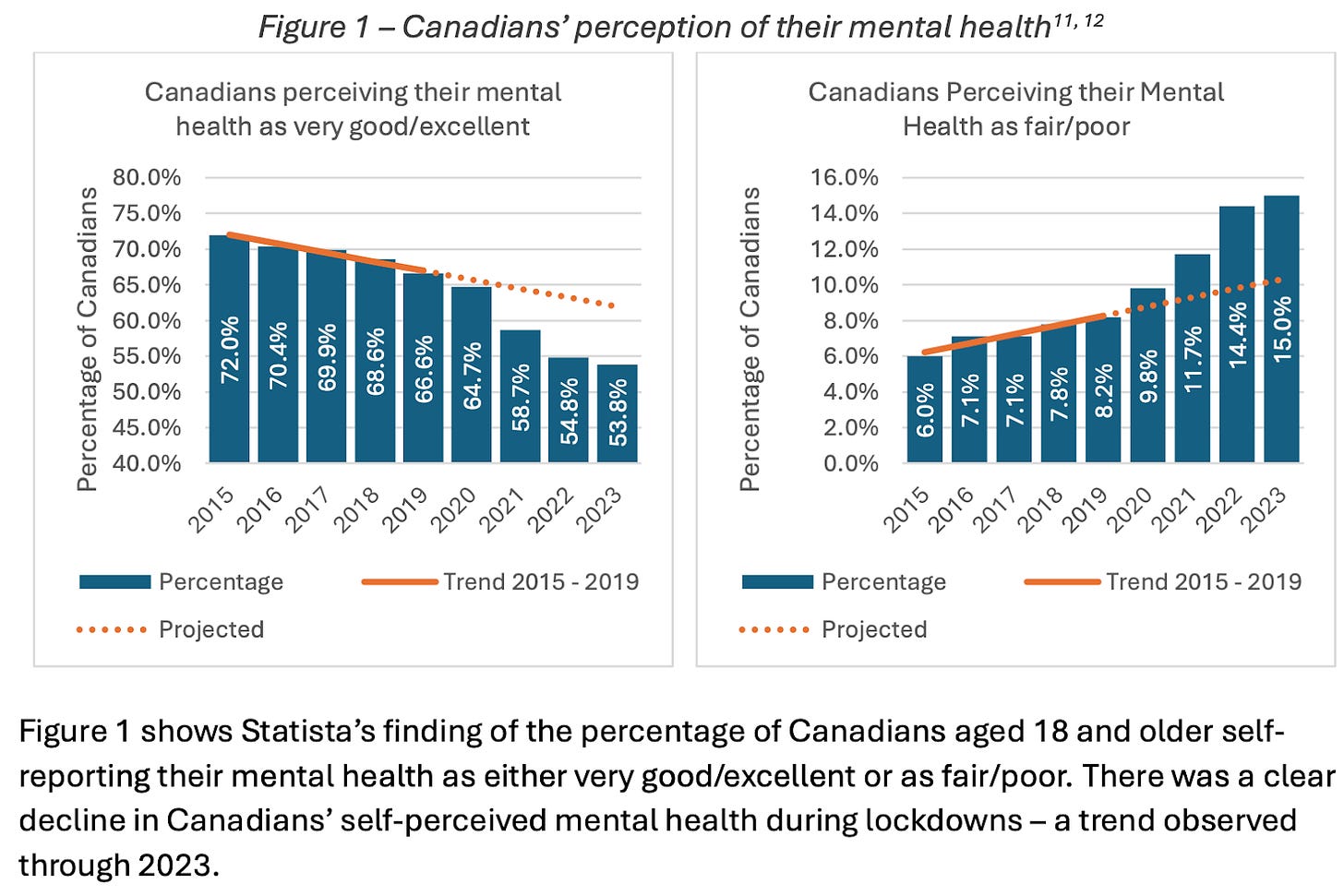 Data published since the pandemic has also pointed to broader declines in Canadians’ well-being. A May 2025 report by the Justice Centre for Constitutional Freedoms cited Statistics Canada findings showing self-rated mental health among Canadians aged 12 and older fell from 64 per cent pre-pandemic to 58 per cent during lockdown periods. Young adults aged 18 to 34 reported the lowest levels of self-rated mental health at 51 per cent, while ratings of “fair” or “poor” mental health rose nationally from six per cent in 2015 to 15 per cent in 2023.