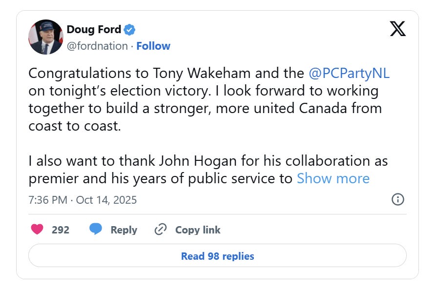 “I look forward to working together to build a stronger, more united Canada from coast to coast,” Ford said in a post on X. “I also want to thank John Hogan for his collaboration as premier and his years of public service to the people of Newfoundland and Labrador.”