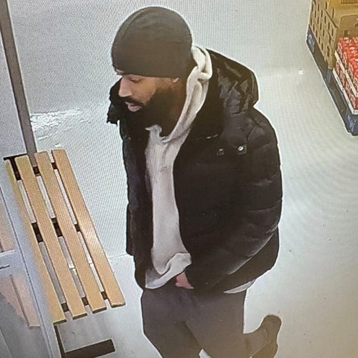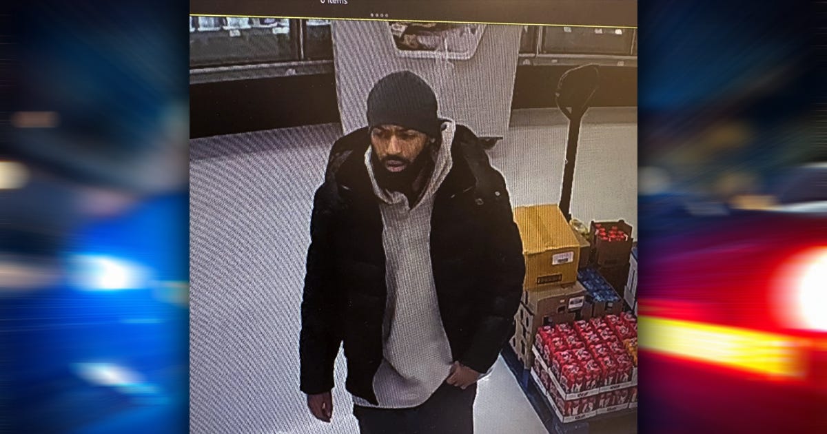 The suspect is described as a Black male of medium build, roughly 200 lbs., with dark brown eyes and a full dark beard. He fled the store in a blue, older-model Honda Civic.