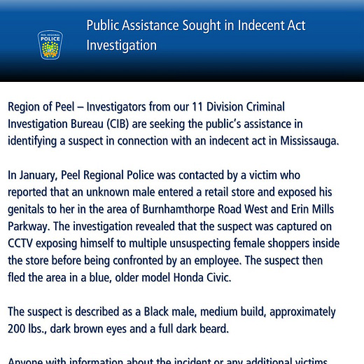Peel Regional Police are asking the public’s assistance after a man allegedly exposed himself to multiple women inside a Mississauga retail store, highlighting ongoing concerns about public safety.