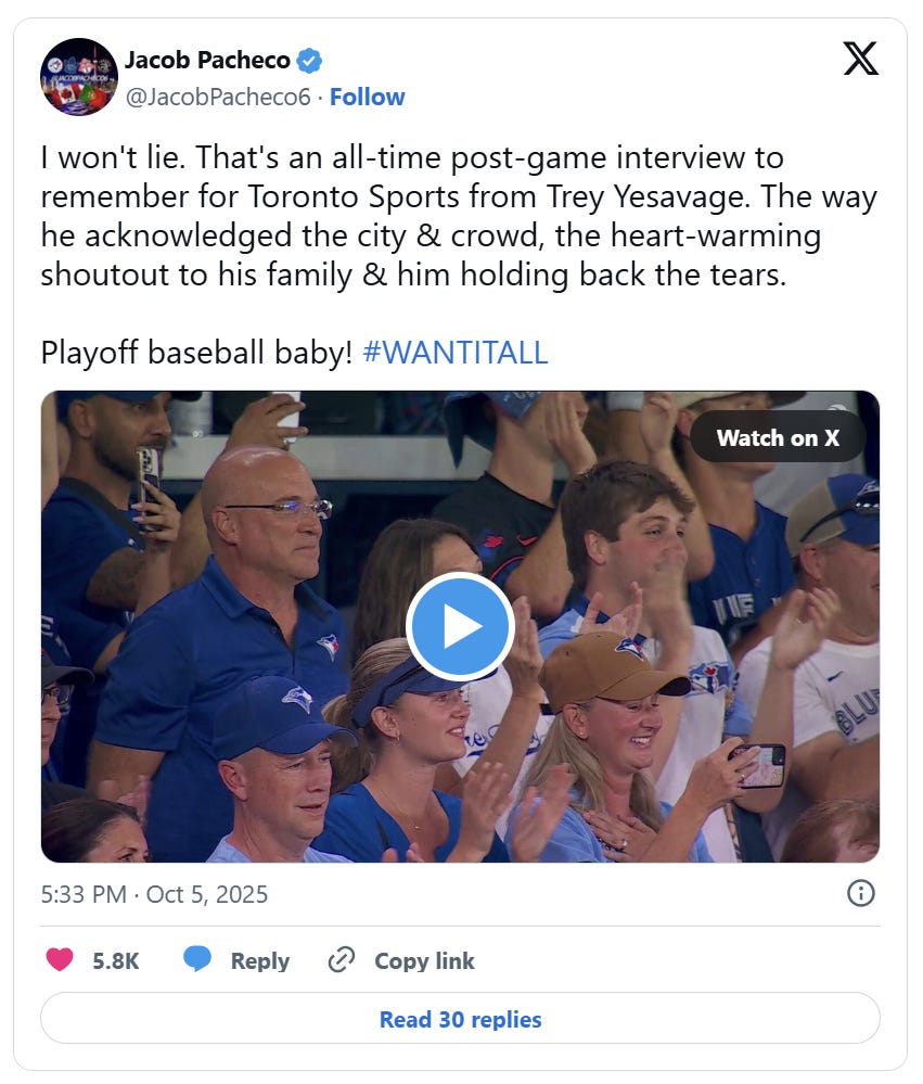 While not getting any airtime on Sportsnet or maybe even as much attention as Yesavage’s family, fans could be seen lining up to take pictures with Poilievre.