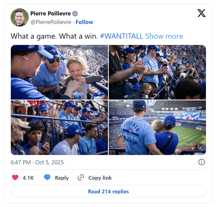 “Pierre Poilievre at a Toronto Blue Jays game: Purchases regular tickets, takes photos with his fellow Canadians, and sits with the average Joe,” said the commentator. “Mark Carney at a Rugby game: Receives VIP treatment and gets premium seating. Pierre is a man of the people, while Carney is an elite.”