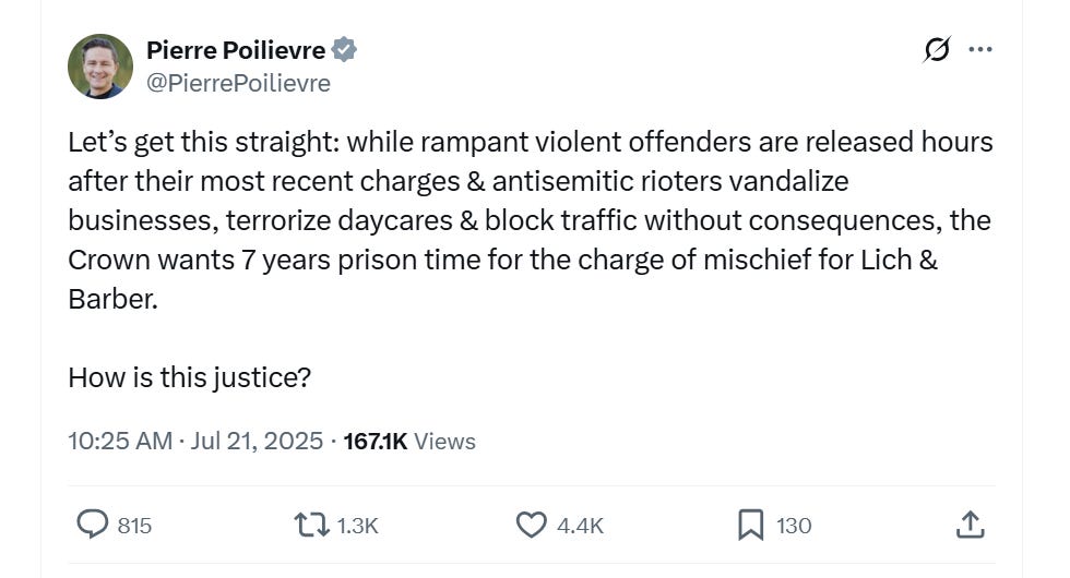 “Let’s get this straight,” Poilievre wrote. “While rampant violent offenders are released hours after their most recent charges & antisemitic rioters vandalize businesses, terrorize daycares & block traffic without consequences, the Crown wants 7 years prison time for the charge of mischief for Lich & Barber. How is this justice?”
