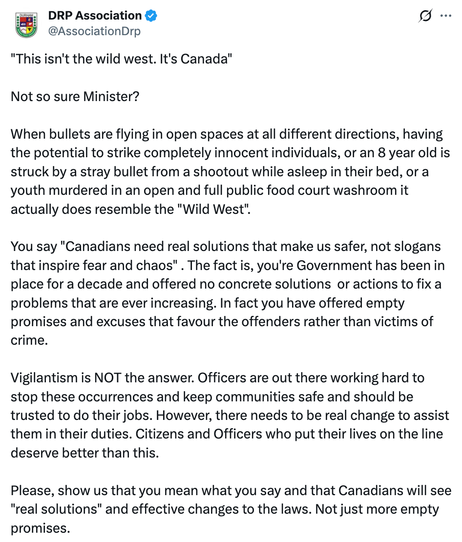 “When bullets are flying in open spaces at all different directions, having the potential to strike completely innocent individuals, or an 8 year old is struck by a stray bullet from a shootout while asleep in their bed, or a youth murdered in an open and full public food court washroom it actually does resemble the “Wild West,”” wrote DRP in a post to X on Tuesday.
