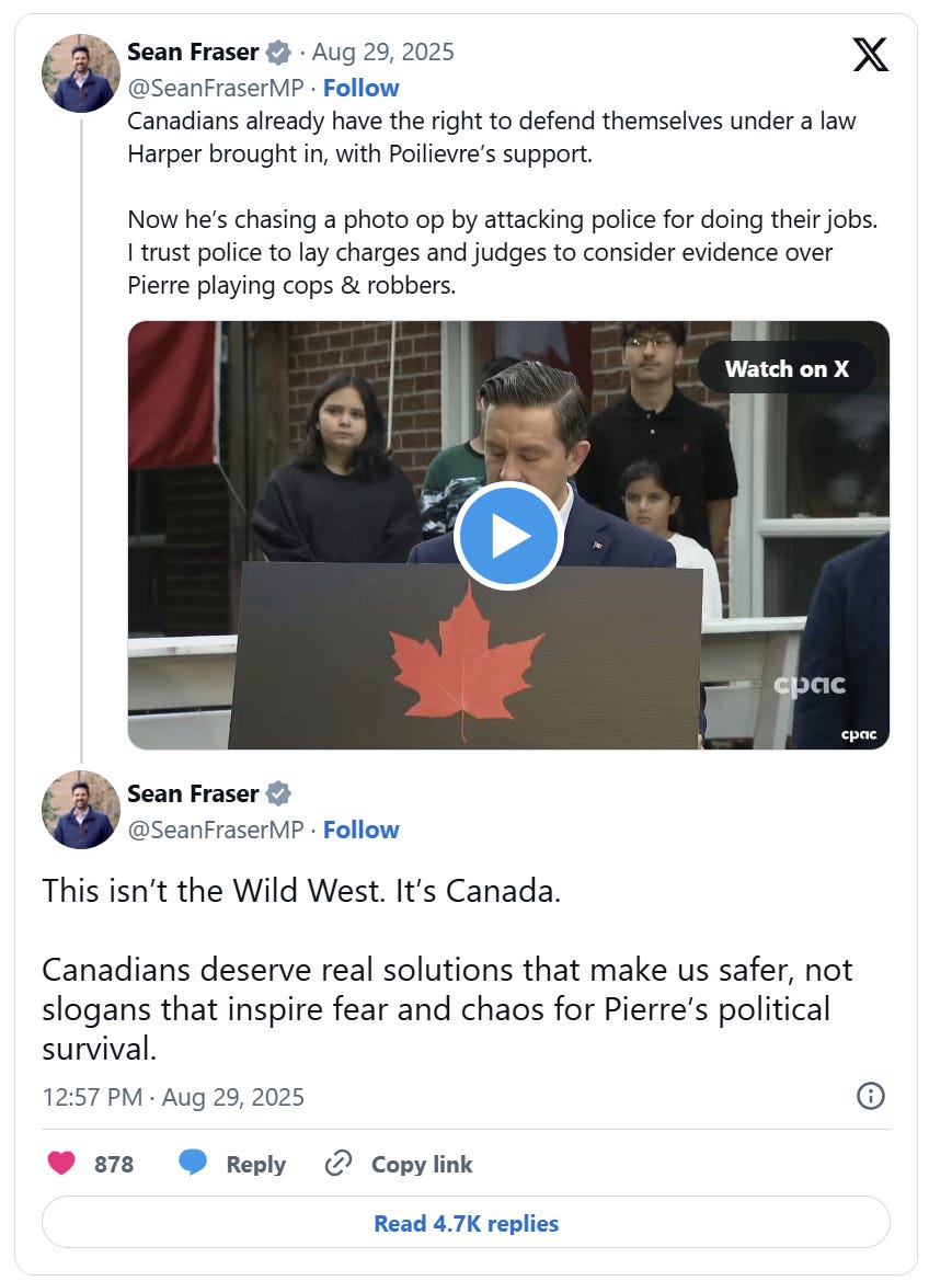“Canadians already have the right to defend themselves under a law Harper brought in, with Poilievre’s support,” wrote Fraser in response to Poilievre’s proposal in a post to X on Monday.