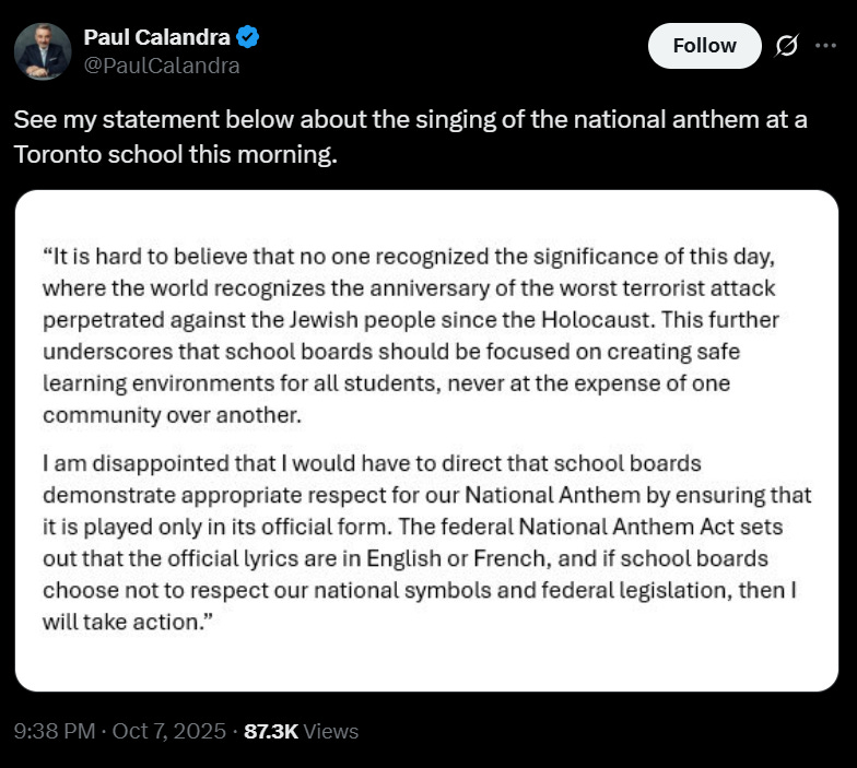 "Nobody really thought about whether it was allowed". Poor excuse. This is Canada. These are public schools and therefore the anthem should be in English or French. The anthem should be a way of showing national pride to those children of different backgrounds/cultures who now live in Canada. Would this happen in any other country?