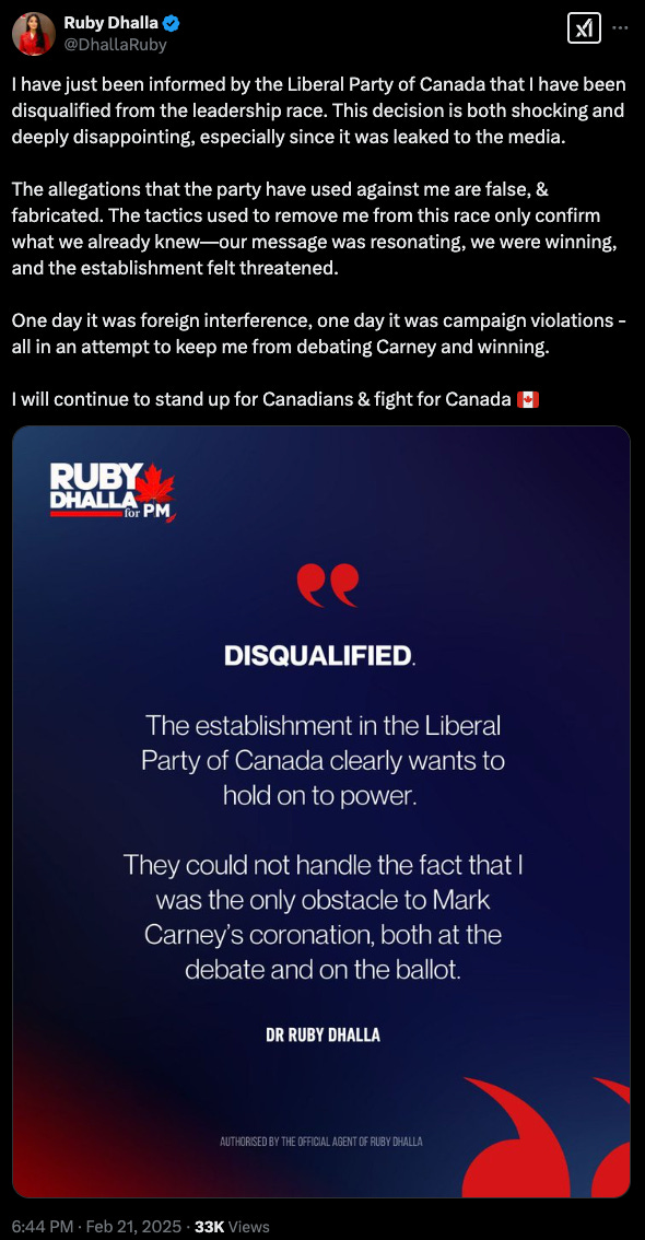 According to CBC, an unnamed source said that the Liberal Party of Canada has unanimously decided to disqualify Dhalla from its leadership race.
