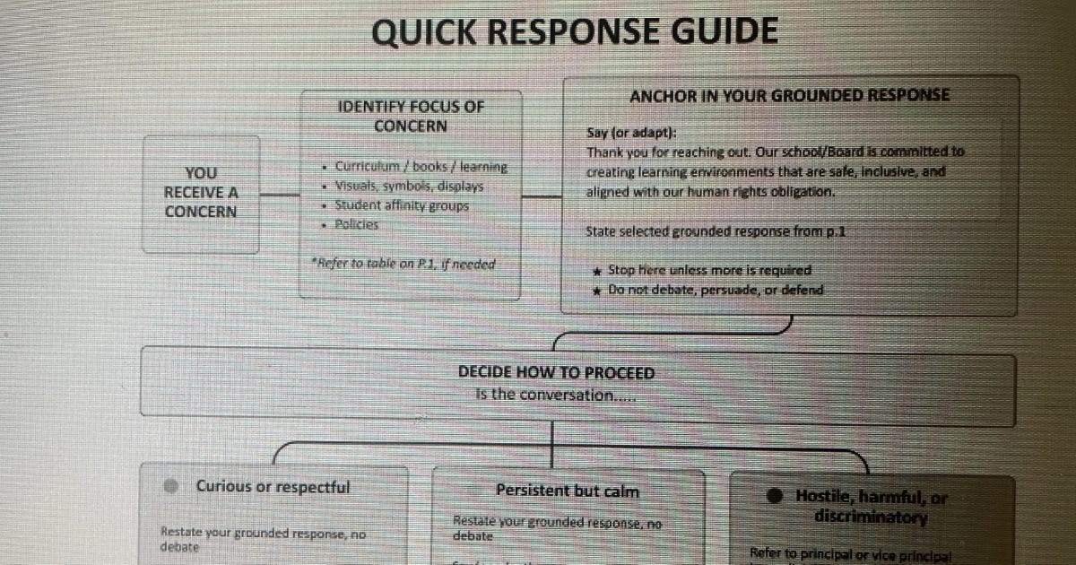 The document, described as an “identity-affirming” quick response guide, outlines a scripted process teachers should follow when parents raise concerns about their children’s school exposure.