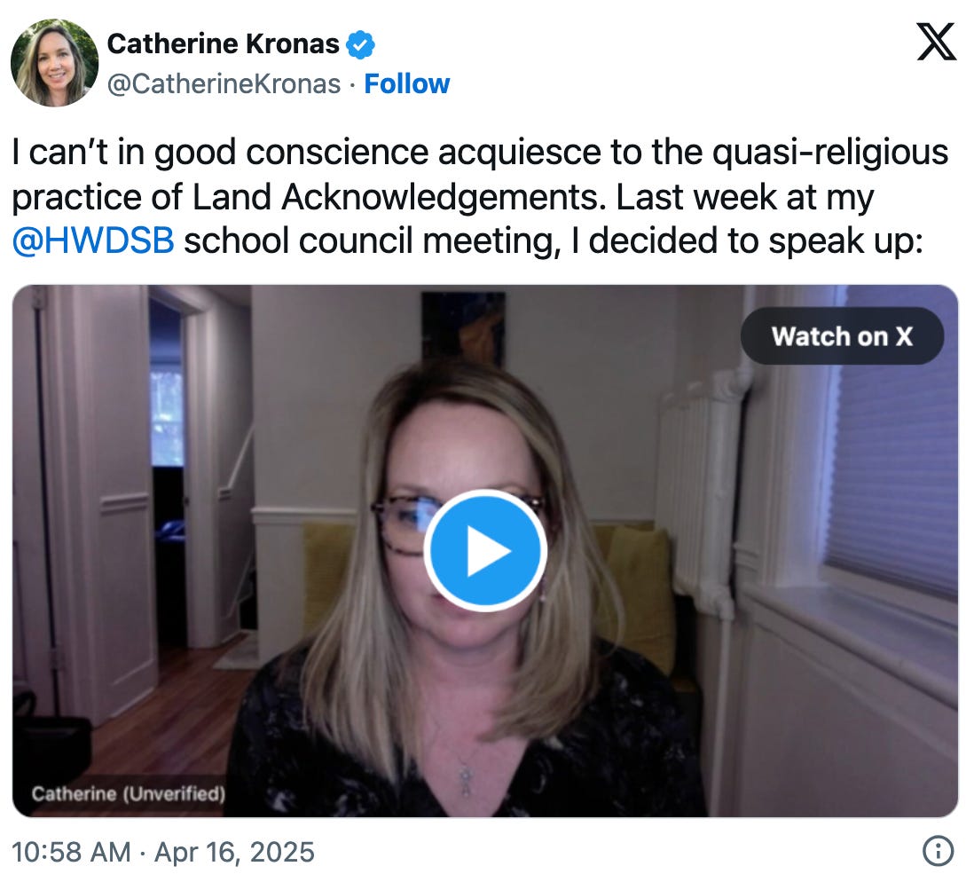There is no school board policy mandating the use of land acknowledgements during council meetings. Kronas has stated that she considers imposing them in public institutions amounts to compelled political speech.