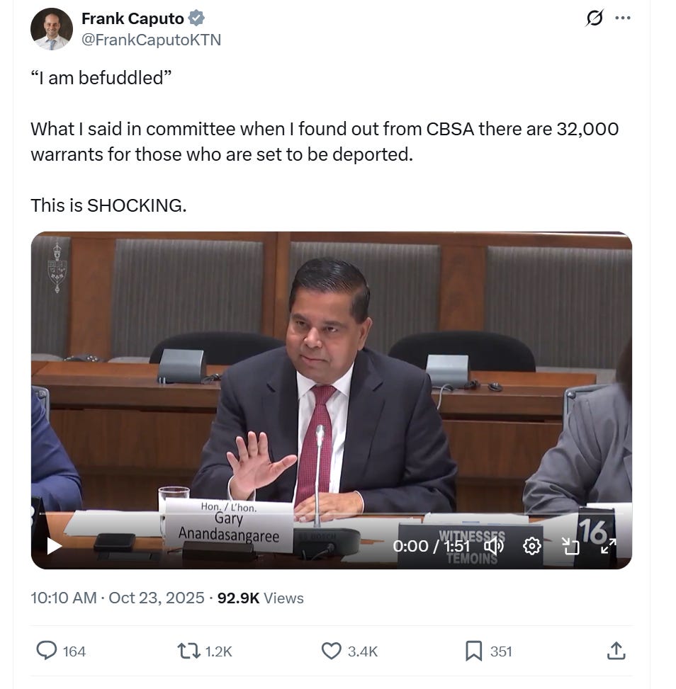 Conservative justice critic Frank Caputo first grilled Public Safety Minister Gary Anandasangaree, asking about the 30,000 individuals that CBSA Vice-President Aaron McCrorie told MPs Wednesday were being pursued for deportation.